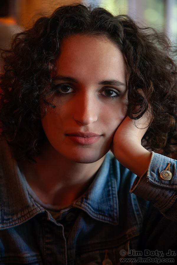 Poses and I were traveling across far northern Michigan and we stopped at Legs Inn in Cross Village Michigan for lunch. (“Poses” is her professional name.) Fortunately for us, we were seated at a table that had just about perfect portrait light. Nice, neutral light was coming in from an outside window on the right (camera right), and soft, warm interior light was coming from the left.
