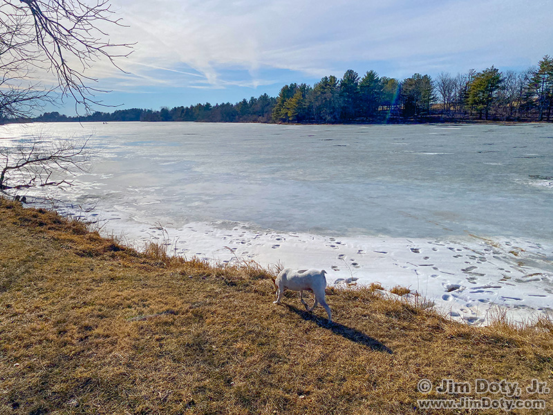 I was looking at some iPhone photos from a month ago and came across this photo. My dog and I were out walking at one of the local lakes and I took this picture with my iPhone. Hundreds of yards off in the distance (upper left) I saw some people on the lake, so I got out my “toy” camera and lens. (See the 2nd and 3rd links below).