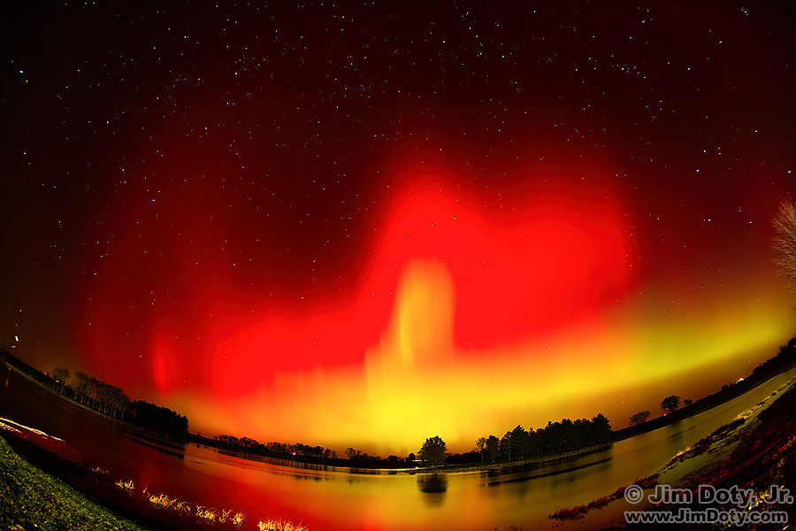 The Northern Lights over southern Iowa were the brightest I have ever seen. A long row of cars showed up at the lake as people came to watch. The lights filled so much of the sky that I used a 15mm lens that has a 180 degree diagonal angle of view to take most of it in.