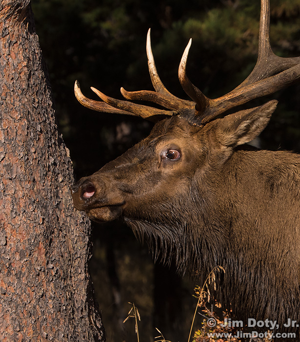 This is one of the most enraged bull elks I have ever witnessed. He was on the attack (another bull elk is on the opposite side of the tree) and in his rush to get the other bull he came within a few feet of running over a photographer.