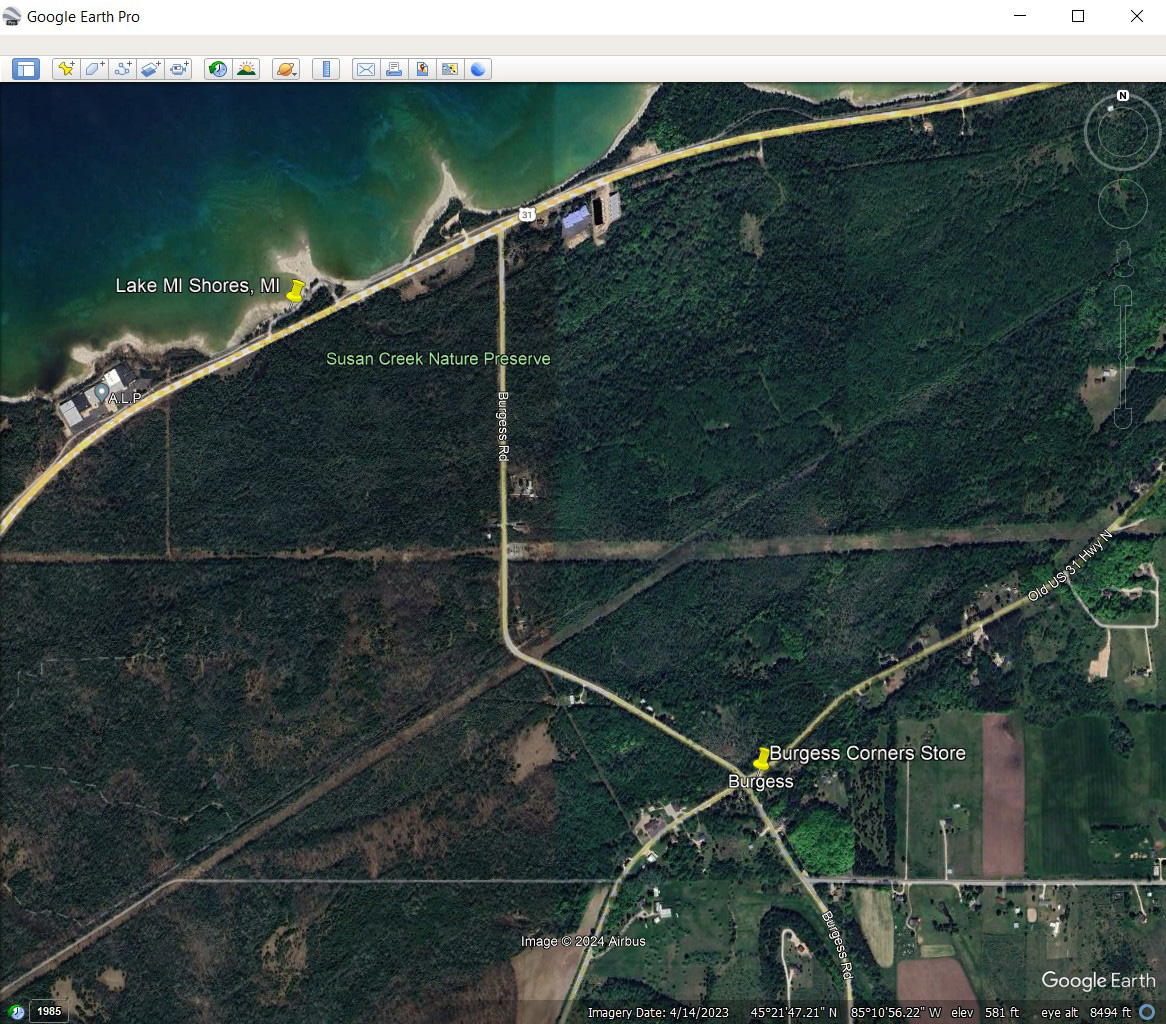 From Charlevoix Michigan go east on U.S. 31. From Petoskey Michigan go west on U.S. 31. Turn south on Burgess Road and go one mile to Old U.S. 31. The store is on the southeast corner of the intersection, marked on this map with a yellow pin.