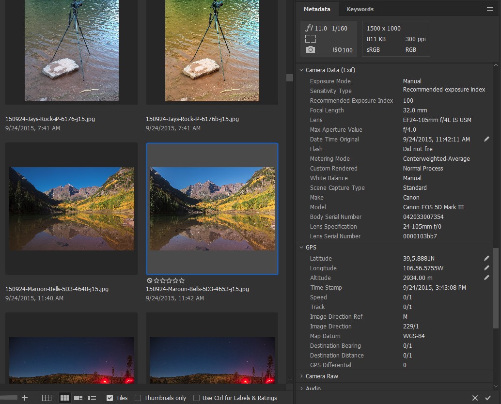 This is the thumbnail of the Maroon Bells photo on my desktop right below the owl’s left eye. The steps to find the metadata are easy.