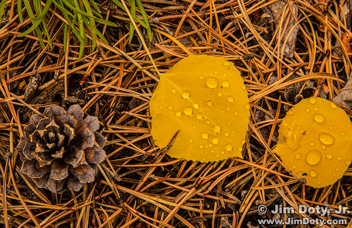 Aspen leaves with dew, pine cone and needles, Rocky Mountain National Park, Colorado. September 30, 2016.