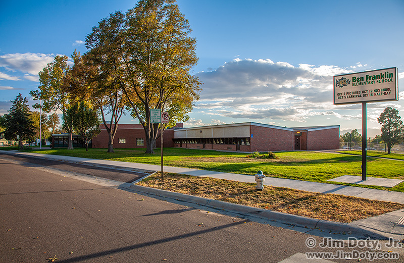 My fall in Colorado series. This is not my typical fall color in the mountains photo. On October 10, 2007, I was on my way home from the Colorado Rockies and stopped in Pueblo long enough to photography my elementary school. At least there is fall color in the trees.