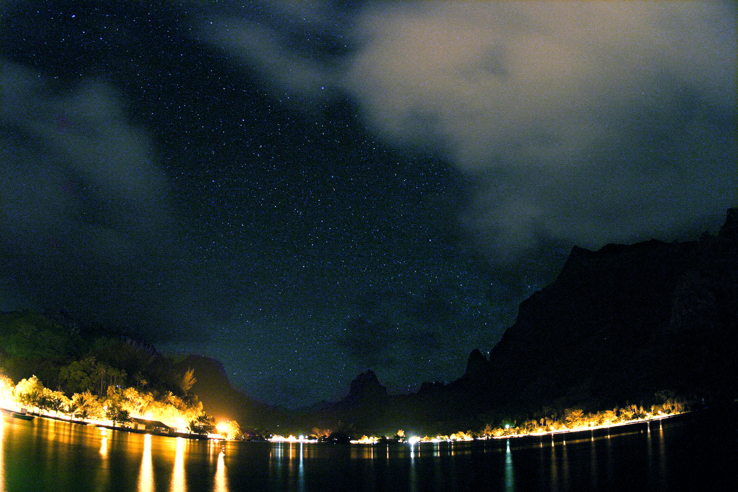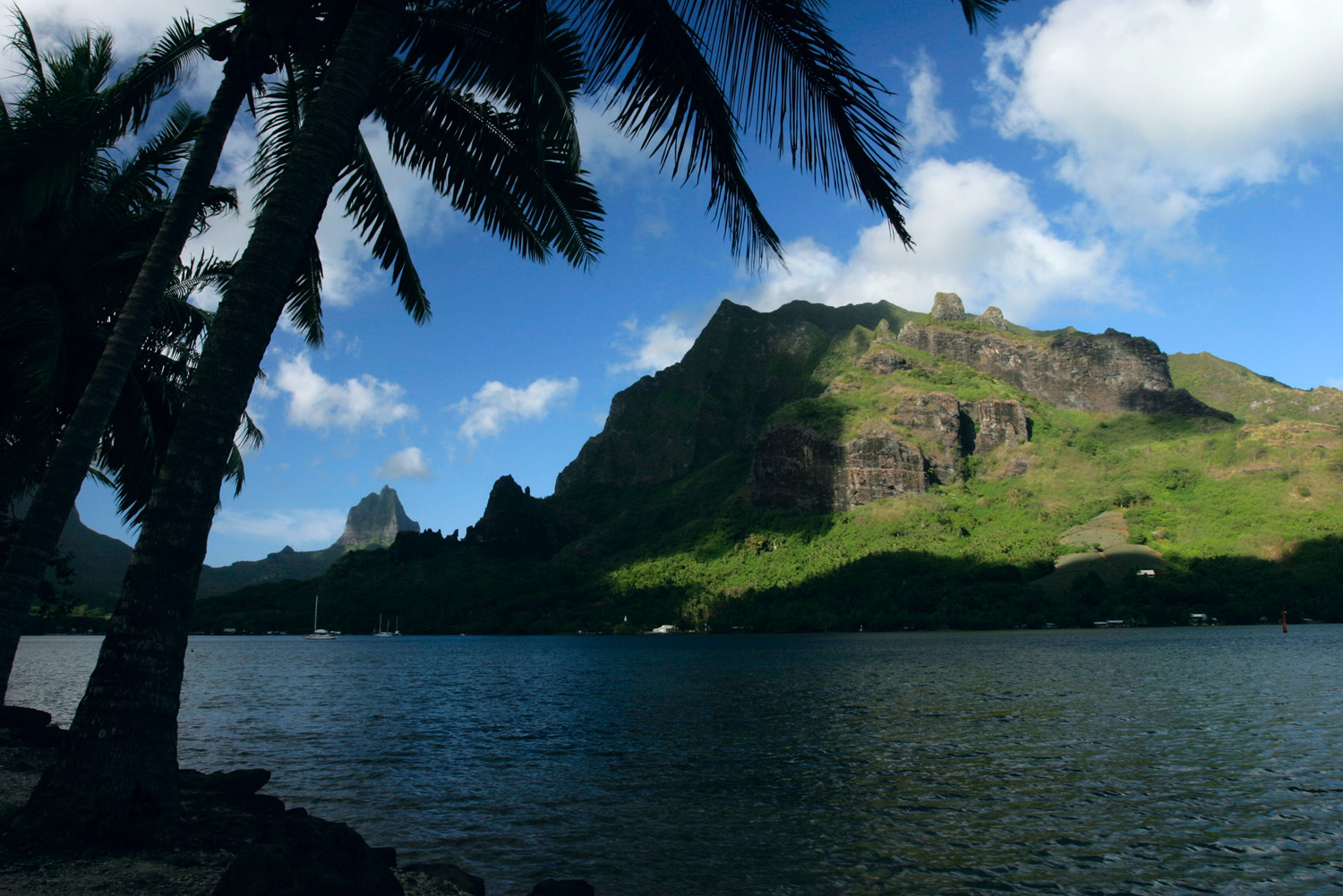 Mt. Mou’aroa, the “Shark’s Tooth” (far left) and Mt. Rotui over Cook’s Bay, Mo’orea, French Polynesia. Oct 11, 2004.