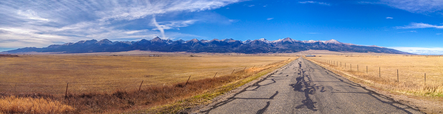 A panoramic views of the Sangre de Cristo Mountains and Hermit Road, Westcliffe, CO. October 28, 2012.