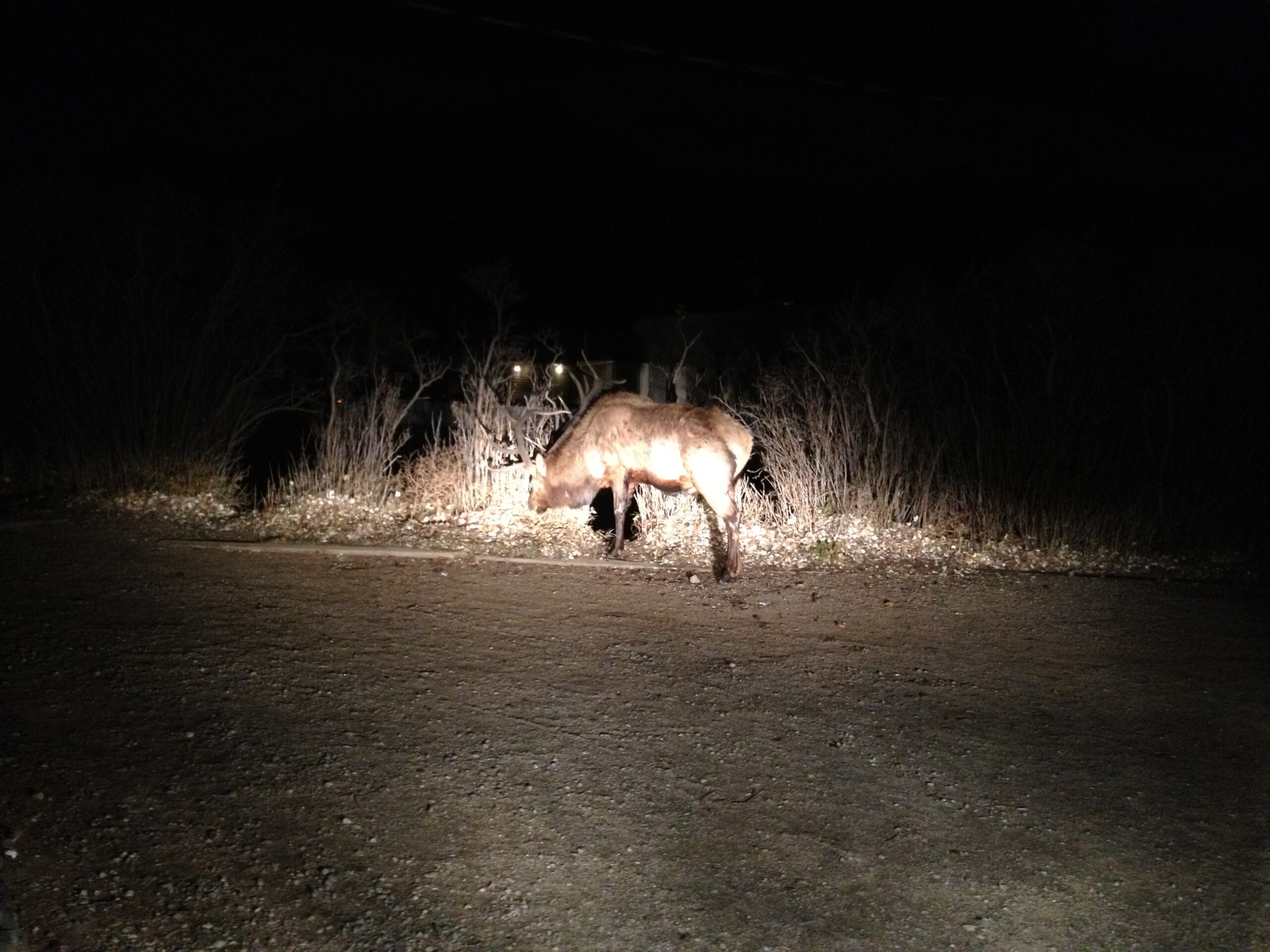 We had to wait for this big boy to quit browsing before we pulled into our parking spot. The owner of the cottages jokingly said, “He owns this place. He just lets us stay here!”