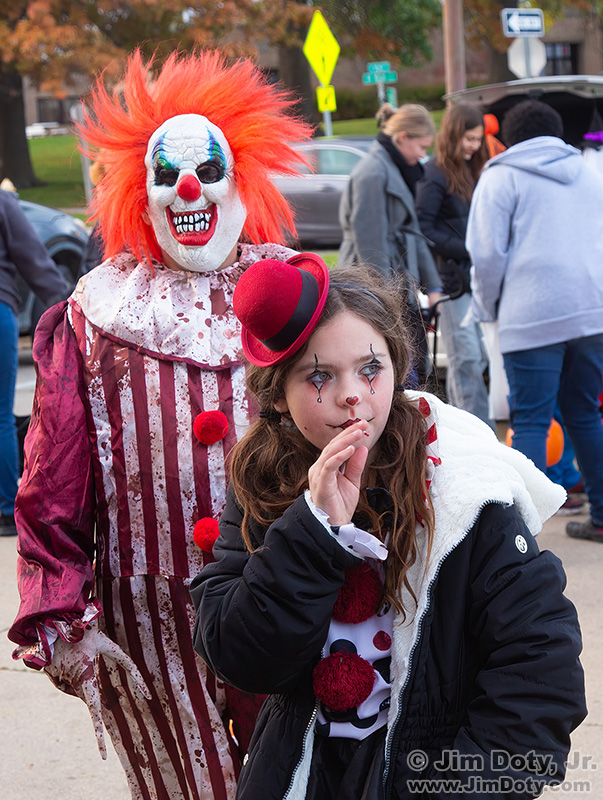 But I decided to go with my first instinct. I cropped the image to show the two central characters. The image immediately above is what I sent to the paper. I like the contrast between the happier clown and the scary character behind her, who is also a clown.