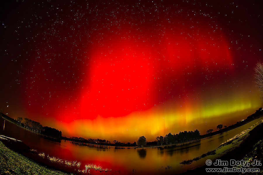 The Northern Lights over southern Iowa were the brightest I have ever seen. A long row of cars showed up at the lake as people came to watch. The lights filled so much of the sky that I used a 15mm lens that has a 180 degree diagonal angle of view to take most of it in.