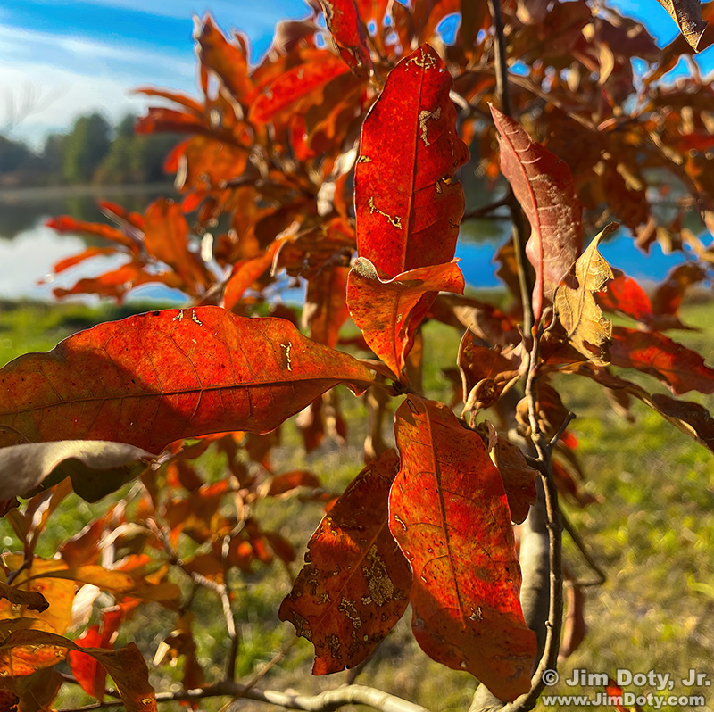 A lot has changed over the last two days. The fall colors are fading in southern Iowa. The prettiest trees are starting to lose their color. A lot of trees are bare and trees with leaves are turning brown. I am still finding patches of color and a few trees that are hanging in there with some nice color. Like yesterday, two of those trees were at Lake LaShane.