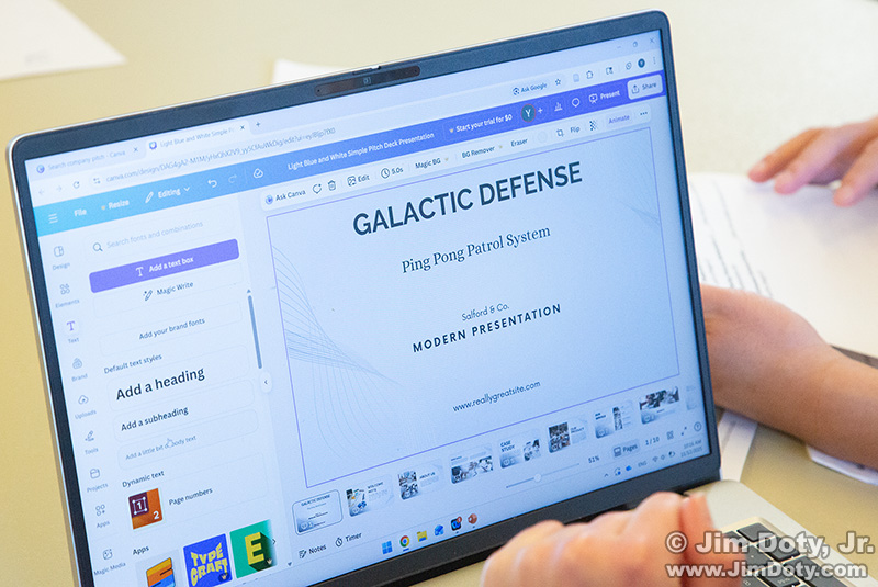 Design teams were pitching their work. The Ag teams wanted to see how well the launchers worked before they spent their money, so the design teams were doing demos. The money from launcher sales, minus the cost of supplies, determined each design team’s profit. The design teams with the most profits were the winners.