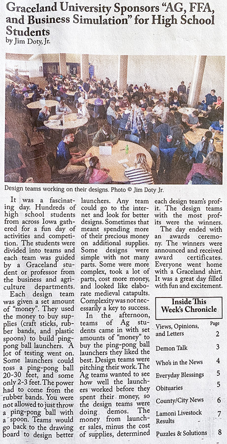 It was a fascinating day. Hundreds of high school students from across Iowa gathered for a fun day of activities and competition. The students were divided into teams and each team was guided by a Graceland student or professor from the business and agriculture departments.