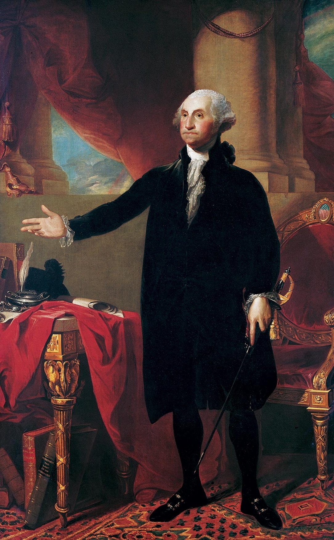 This is the famous “Lansdowne portrait” of President Washington by Gilbert Stuart. Stuart painted 3 famous portraits of Washington (and Stuart followed up by painting many copies of the originals due to lots of requests). The Lansdowne portrait is named for the Marquise of Lansdowne, former British Prime Minister and recipient of this painting.