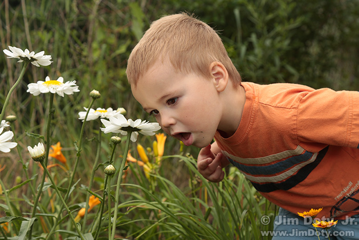 I was 45 minutes into our “casual” photo shoot when he discovered some insects on top of the daisies in our sun garden. Out of 8 photos of him checking out the daisies, the first is my favorite. Patience is key!